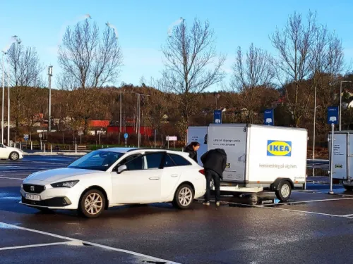 Just outside the IKEA mall, there are arrays of trailors waiting where you can probably rent (not sure how it works). I saw a person backed his own car and attached the box to a tow bar. I am someone who drives a small car and always have a problem packing Ikea stuffs. What an innovative service!